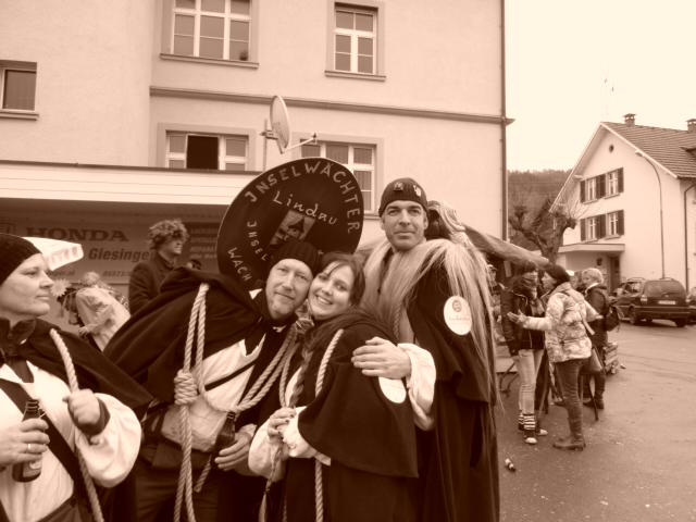 Genau 350 Jahre nach ihrem plötzlichen Verschwinden im Jahre 1659 tauchten 2009 die Inselwächter wieder in Lindau auf. Eine Narrengruppe um Gründer Achim Jaeger hatte sich den Namen nach den historischen Vorbildern gegeben und ist inzwischen gern gesehener Gast auf vielen Narrensprüngen in der Umgebung.Das hätte sich Achim Jaeger noch vor ein paar Jahren nicht träumen lassen, dass er einmal anstatt als Zuschauer bei den Narrenumzügen dabei zu sein, als Hästräger selbst mitspringt. Doch erstens kommt es anders und zweitens, als man denkt. Und daran ist Töchterchen Salina nicht ganz unschuldig. Im zarten Alter von zwei Jahren machte sie das erste Mal während der Fastnacht Bekanntschaft mit verrückt umherhüpfenden Hexen. Die flößten der Kleinen jedoch keine Angst ein, sondern weckten in ihr eine derartige Begeisterung, dass Papa Achim irgendwann nicht mehr anders konnte, als ihrem vehementen Drängen „Papa, das will ich auch machen“, nachzugeben. Achim Jaeger ist allerdings bedingt durch seinen Beruf viel unterwegs. Die Mitgliedschaft in einem der bestehenden Narrenvereine mit allen Rechten und Pflichten kam für ihn deshalb nicht in Frage. Er hätte nur bedingt am Vereinsleben teilnehmen können. So entstand die Idee, selbst eine Gruppe zu gründen. Die hat eine überschaubare Größe und einen begrenzten Terminkalender ausschließlich während der 5. Jahreszeit. Als Vorbild für die neue Narrengruppe dienen die Inselwächter. Sie sollen hünenhafte und ungestüme Gestalten gewesen sein, die im 30-jährigen Krieg im Auftrag der Bürgerschaft Lindau die Stadt vor Spionen und Saboteuren beschützte, indem sie Verdächtige aufhängte. Als man die Dienste der grausamen Inselwächter nicht mehr benötigte, wurden sie von der Gemeinde im Pulverturm ertränkt. Die Maske entstand in Zusammenarbeit mit Holzbildhauer Simon Stiegeler, der 2011 sogar auf der Expo in Shanghai vertreten sein wird. Sie hat eine schlammfarbige Grundierung, die an die feuchte Erde der Insel erinnert. Die Blauund Grüntöne spiegeln den Bodensee wieder. Der Kopf erinnert an einen Fisch im Menschengesicht. Das Häs ist typisch für die Kleidung des einfachen Mannes im 17. Jahrhundert: schwarzer Umhang, tiefe Kapuze, einfaches Leinenhemd, steingraue Hose.